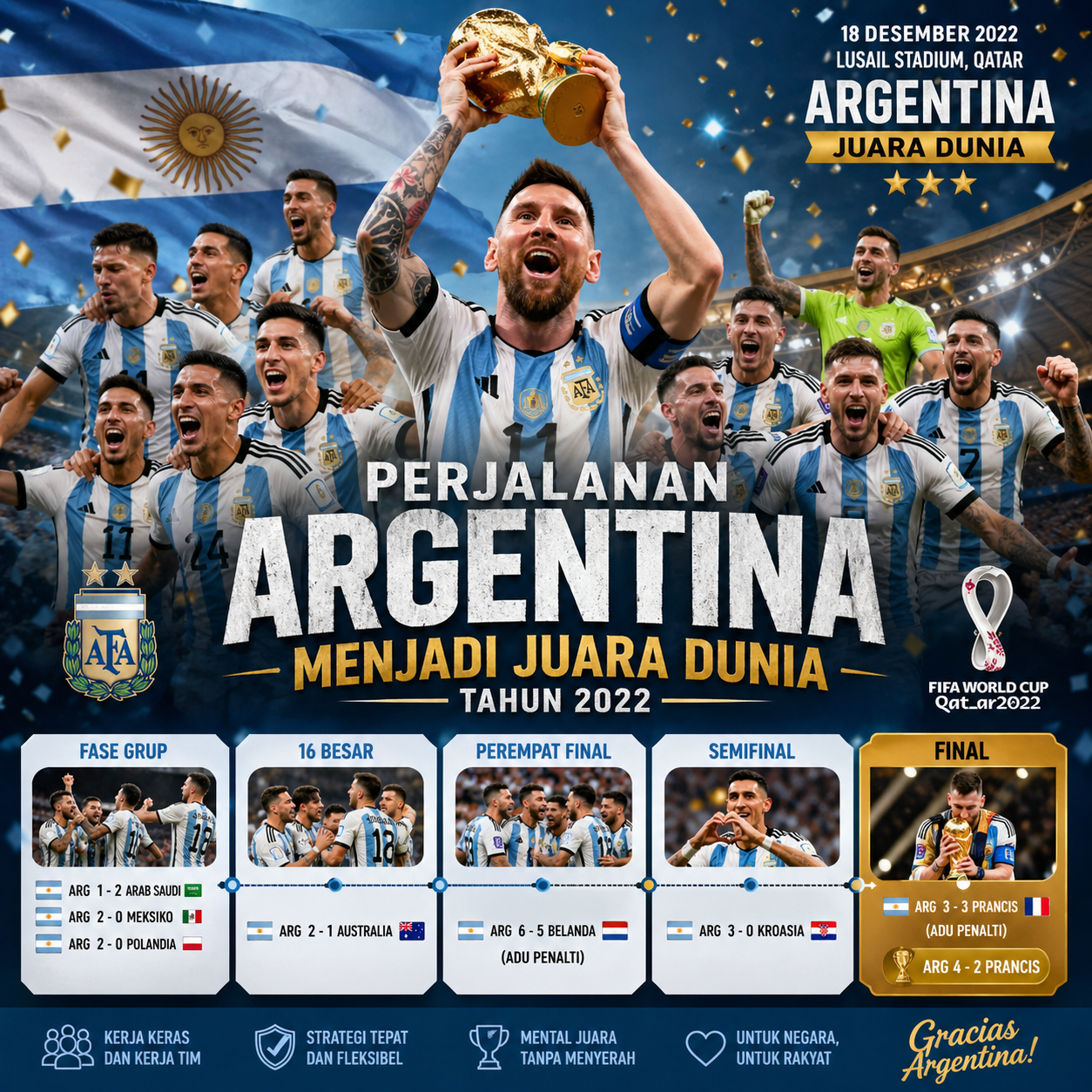 Kemenangan Argentina di Piala Dunia 2022 bukan hanya sekadar trofi, tetapi juga menjadi warisan sejarah yang memperkuat posisi mereka di dunia sepak bola. Lionel Messi akhirnya melengkapi kariernya dengan gelar dunia yang paling diidamkan, sementara Argentina kembali mengangkat trofi setelah penantian panjang. Dalam konteks E-E-A-T, pembahasan ini menekankan pengalaman, kepemimpinan, konsistensi, dan sumber informasi yang dapat dipercaya sebagai dasar memahami perjalanan besar sebuah tim. Perjalanan Argentina menjadi juara dunia tahun 2022 memberikan pelajaran bahwa kerja keras, strategi tepat, dan mental kuat mampu mengubah tekanan menjadi kemenangan bersejarah.